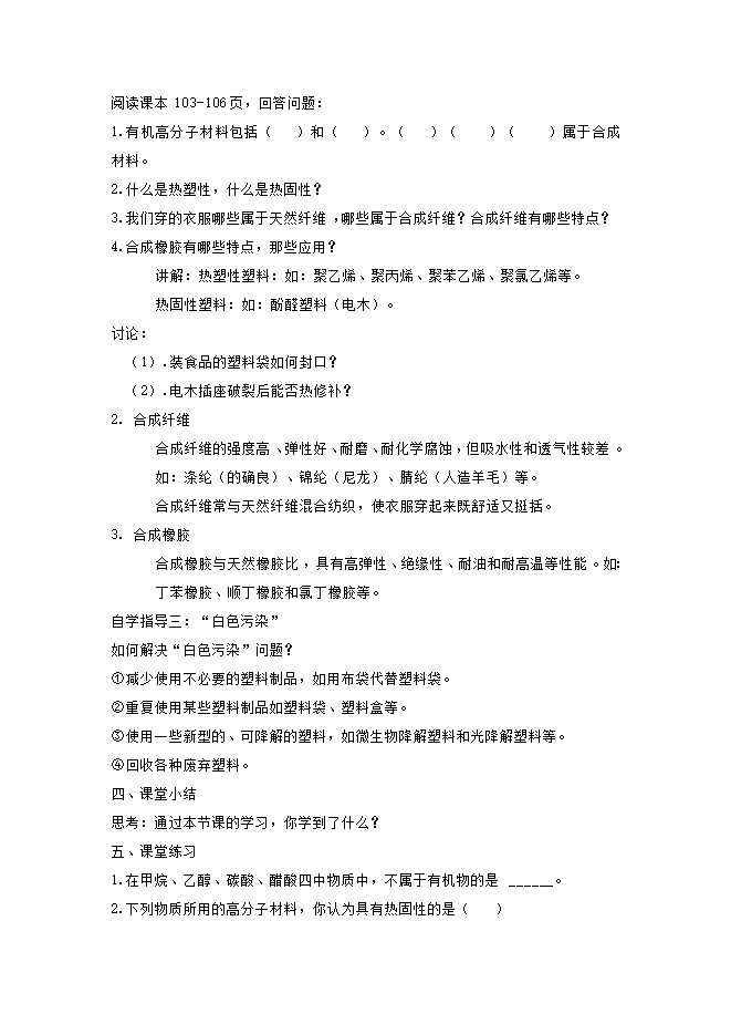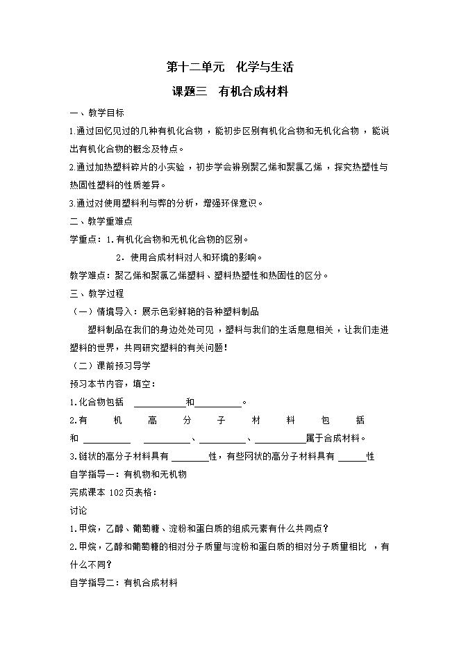 【内容简介】人教版九年级化学下册《12.3有机合成材料》导学案 (word版无答案)