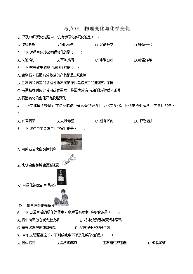 2019年九年级化学中考考点突破考点01 物理变化与化学变化(原卷版)