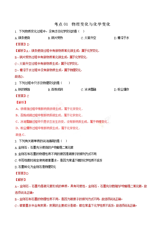 2019年九年级化学中考考点突破考点01 物理变化与化学变化(解析版)