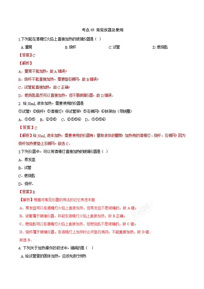 2019年九年级化学中考考点突破考点03 常见仪器及使用(解析版)