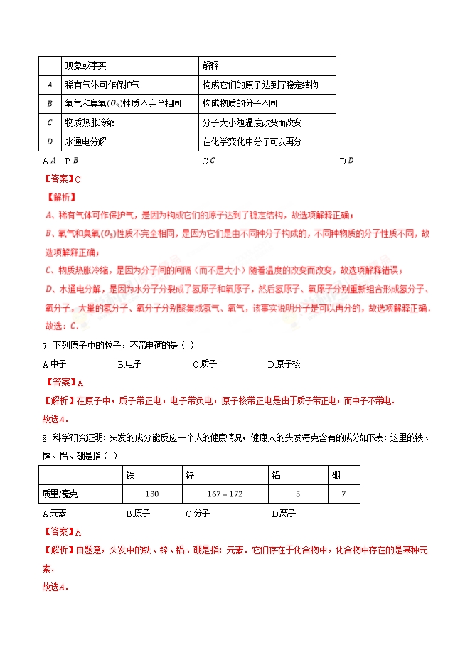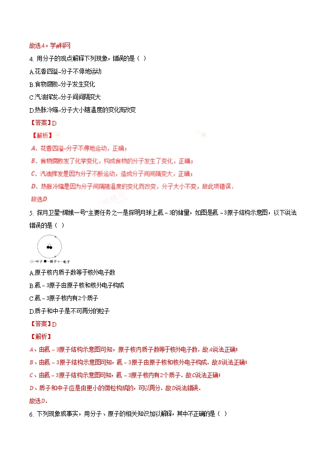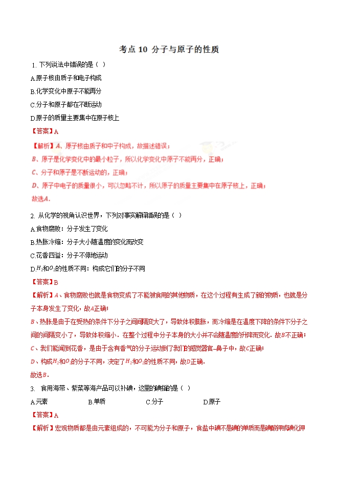 【内容简介】2019年九年级化学中考考点突破考点10 分子与原子的性质(解析版)