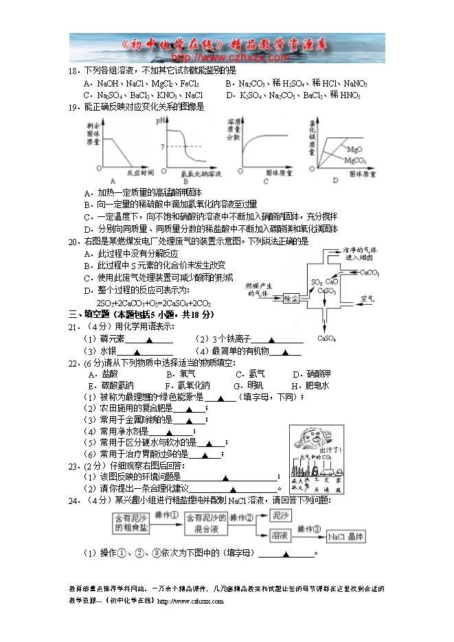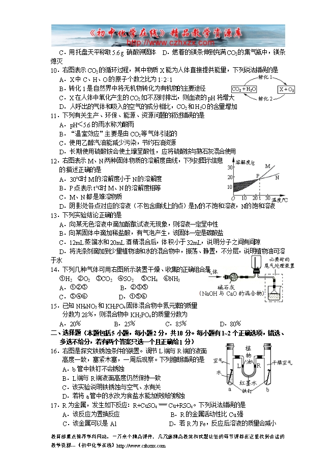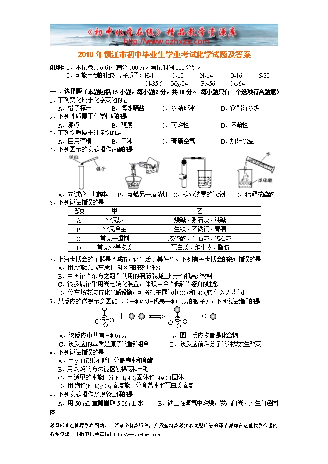 2010年镇江市初中毕业生学业考试化学试题及答案