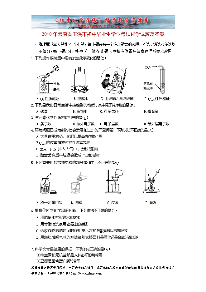 2010年云南省玉溪市初中毕业生学业考试化学试题及答案