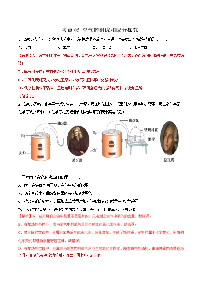 【内容简介】2019年中考九年级化学必刷题考点05 空气的组成和成分探究(解析版)