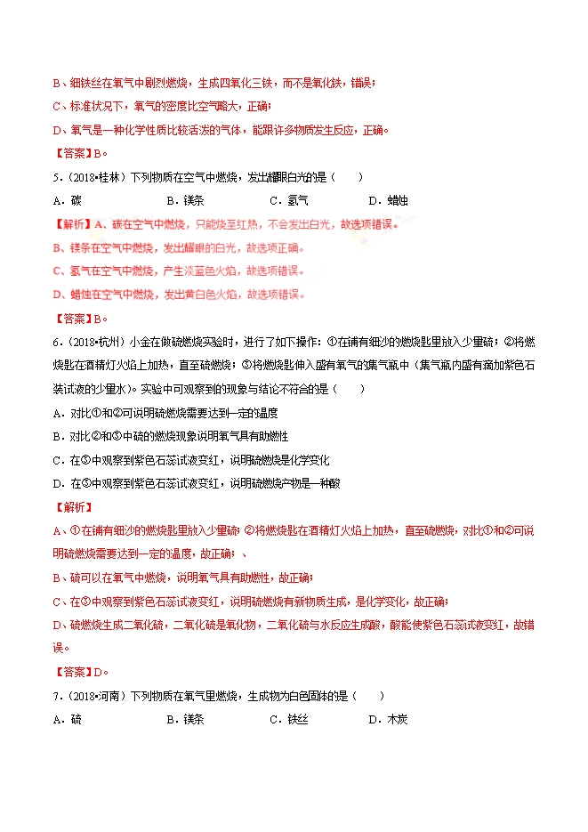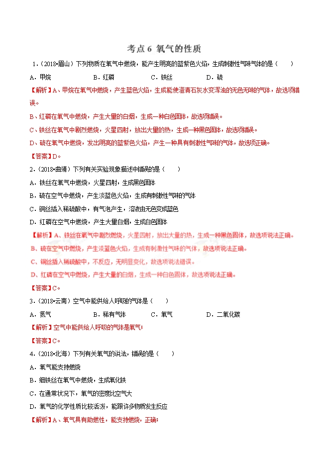 【内容简介】2019年中考九年级化学必刷题考点06 氧气的性质(解析版)