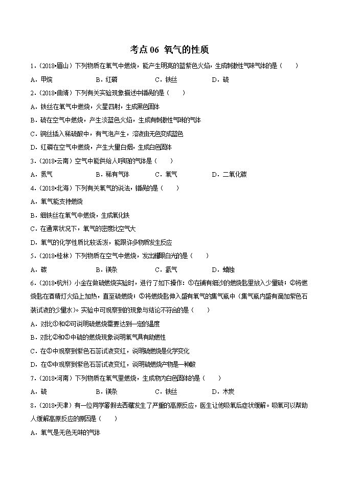 【内容简介】2019年中考九年级化学必刷题考点06 氧气的性质(原卷版)