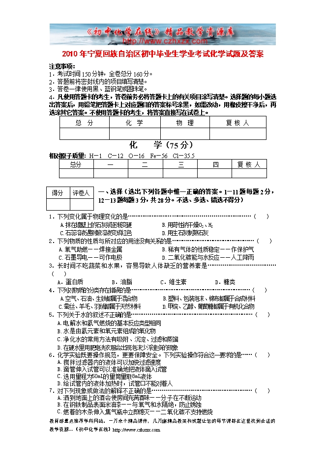 2010年宁夏回族自治区初中毕业生学业考试化学试题及答案