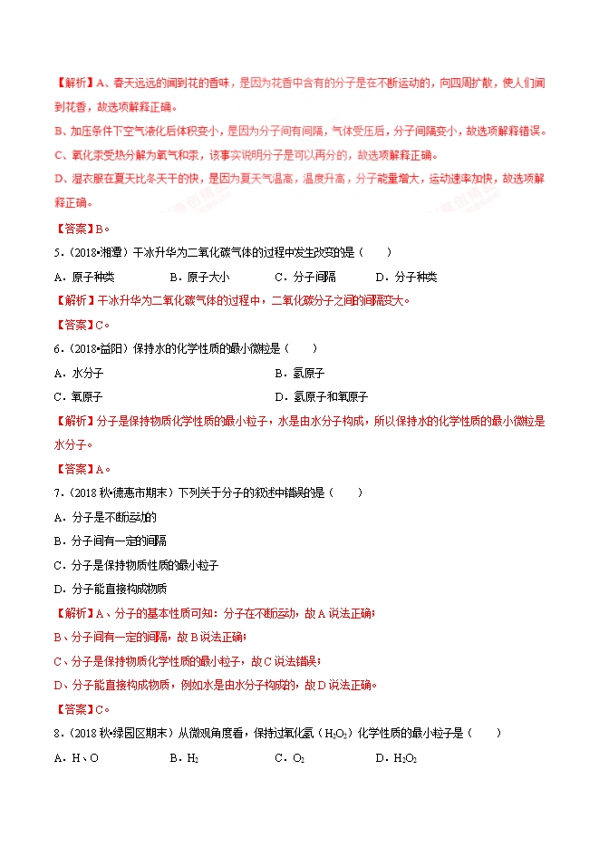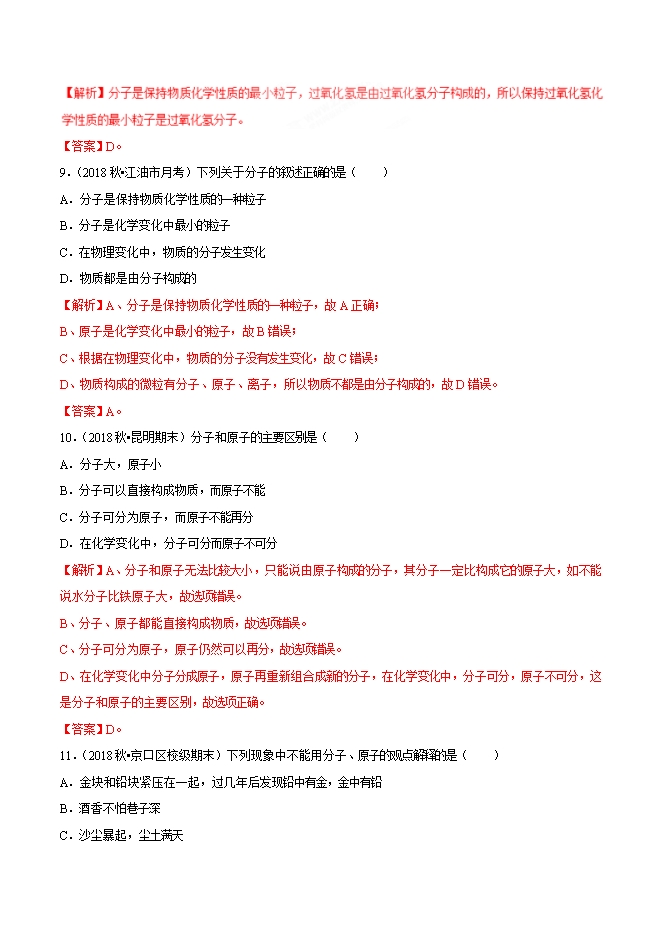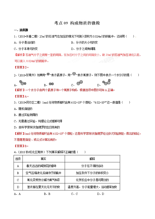 2019年中考九年级化学必刷题考点09 构成物质的微粒(解析版)