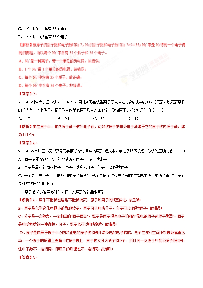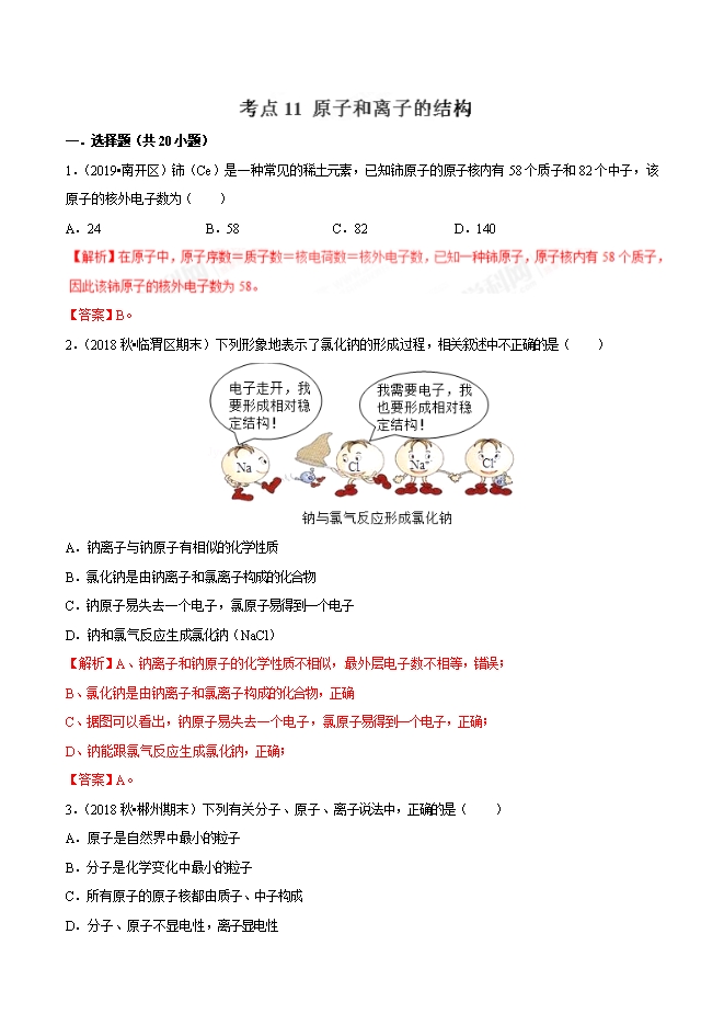 【内容简介】2019年中考九年级化学必刷题考点11 原子和离子的结构(解析版)