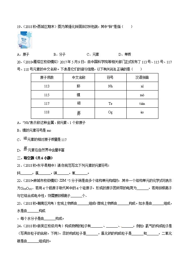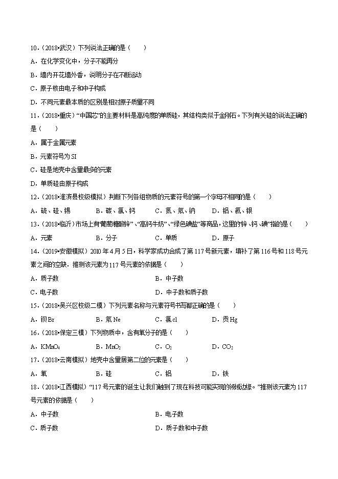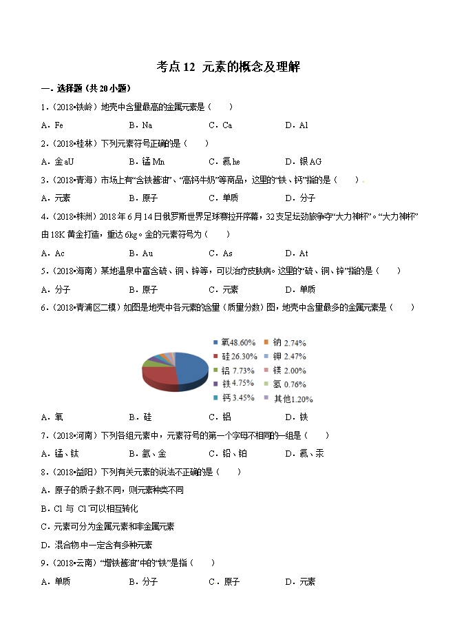 【内容简介】2019年中考九年级化学必刷题考点12 元素的概念及理解(原卷版)