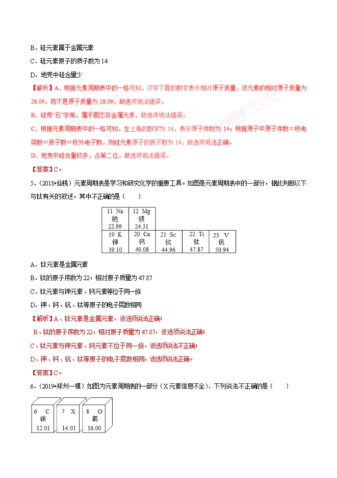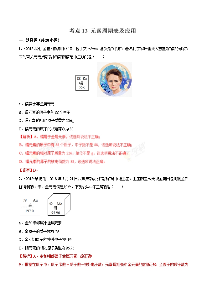 【内容简介】2019年中考九年级化学必刷题考点13 元素周期表及应用(解析版)