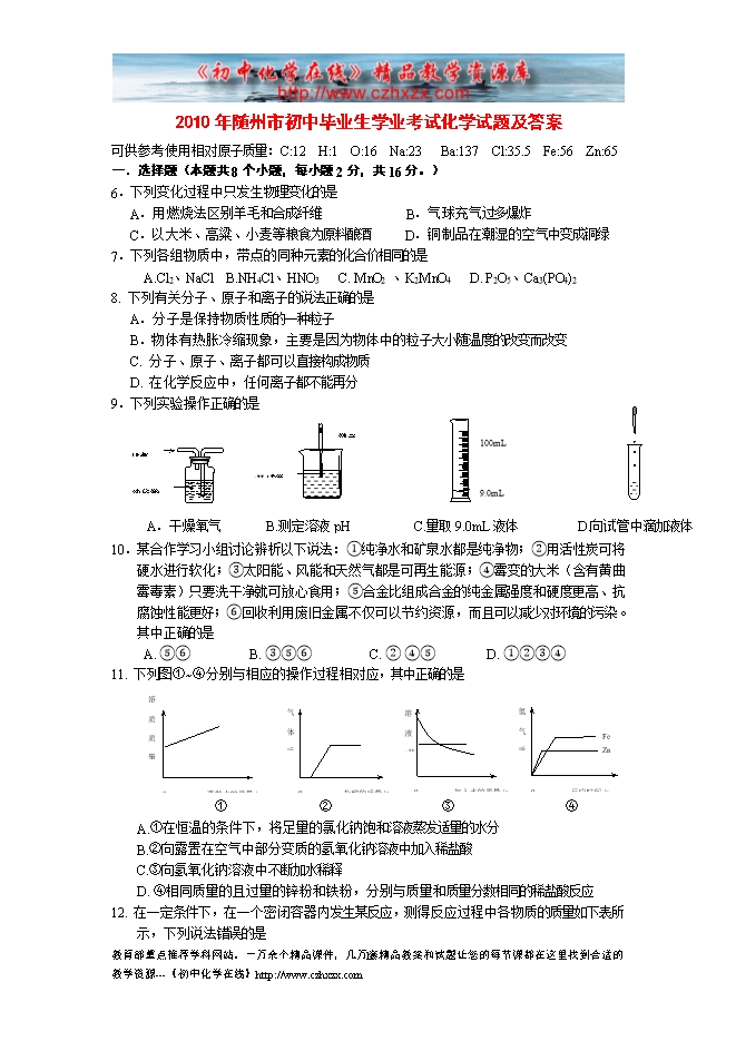 - 下一份试卷:2010年苏州市初中毕业生学业考试化学试题及答案