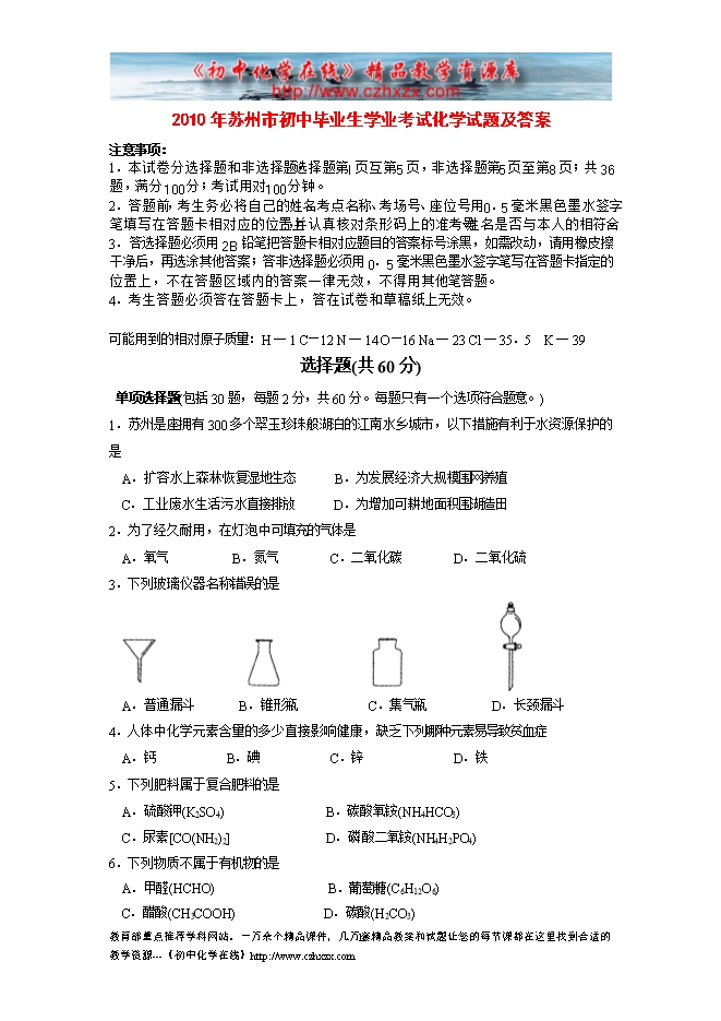 2010年苏州市初中毕业生学业考试化学试题及答案