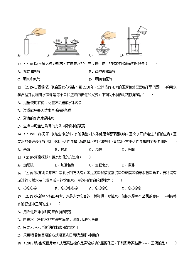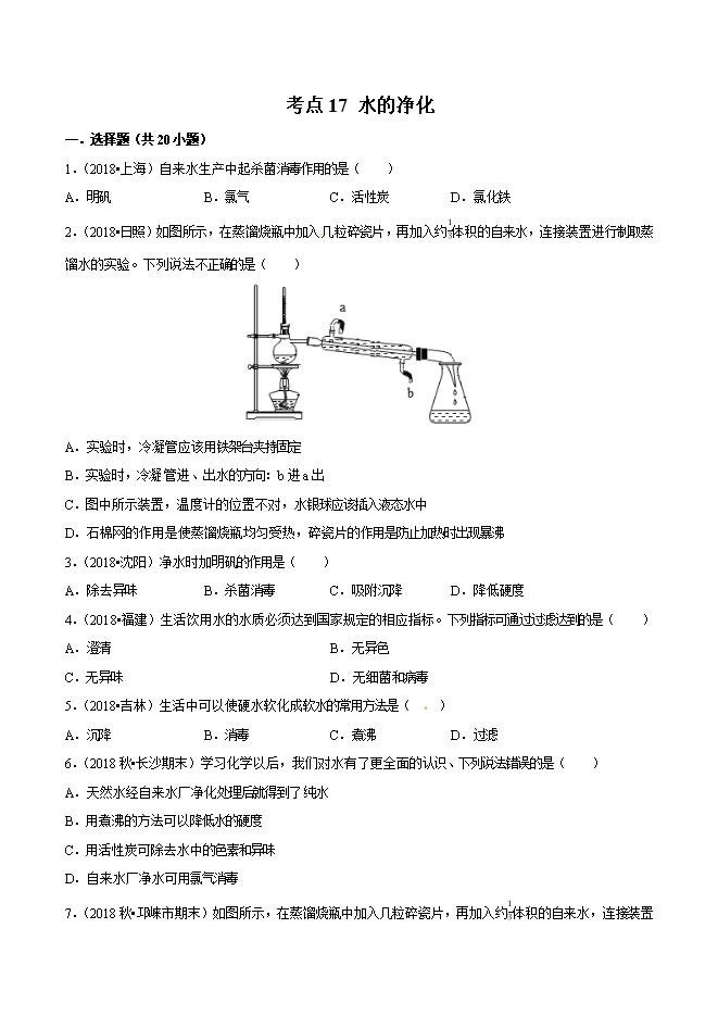 【内容简介】2019年中考九年级化学必刷题考点17 水的净化(原卷版)