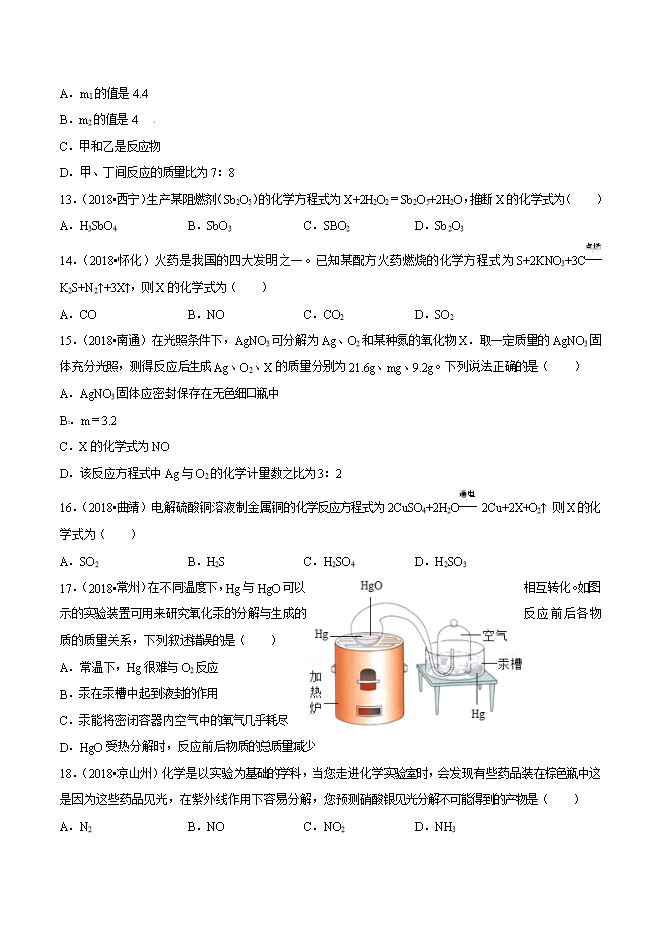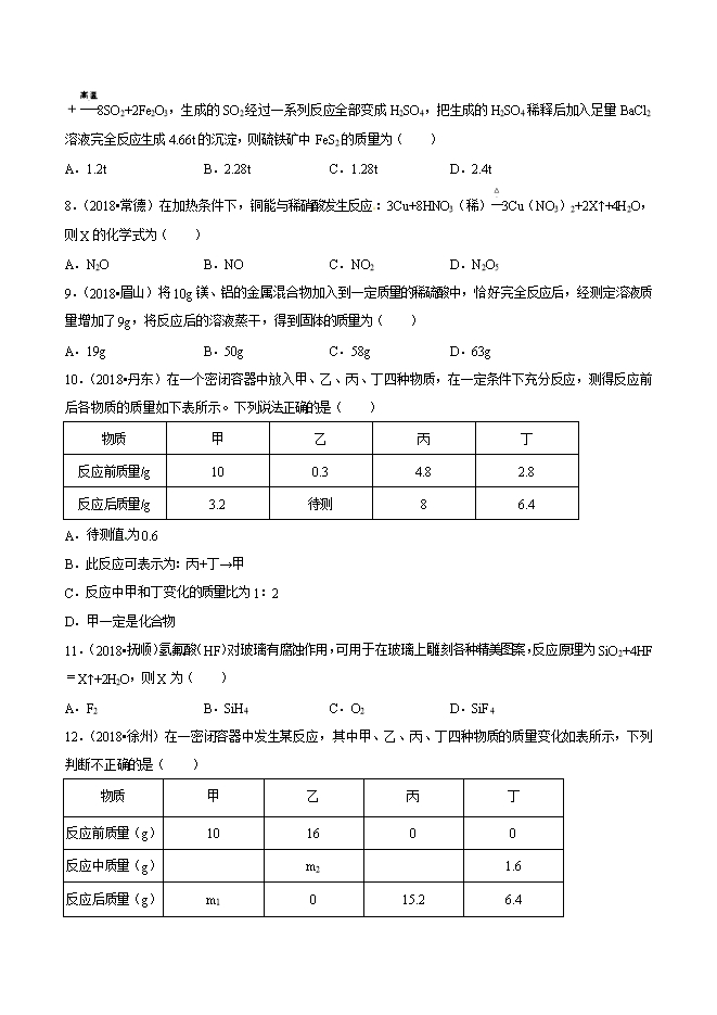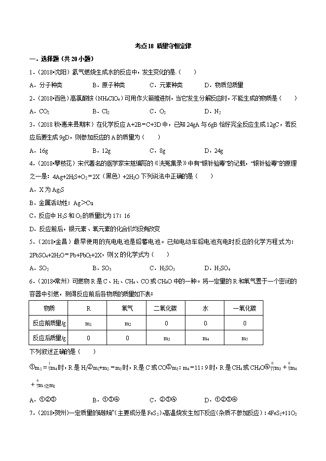【内容简介】2019年中考九年级化学必刷题考点18 质量守恒定律(原卷版)