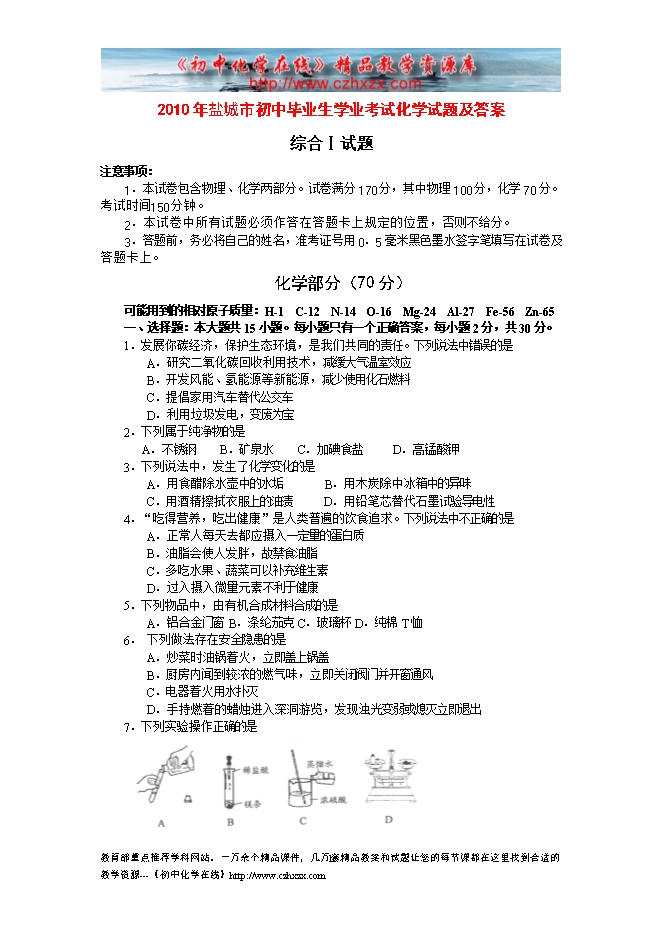 2010年盐城市初中毕业生学业考试化学试题及答案