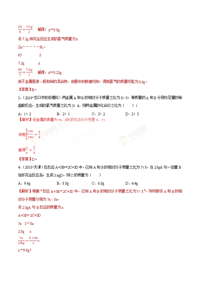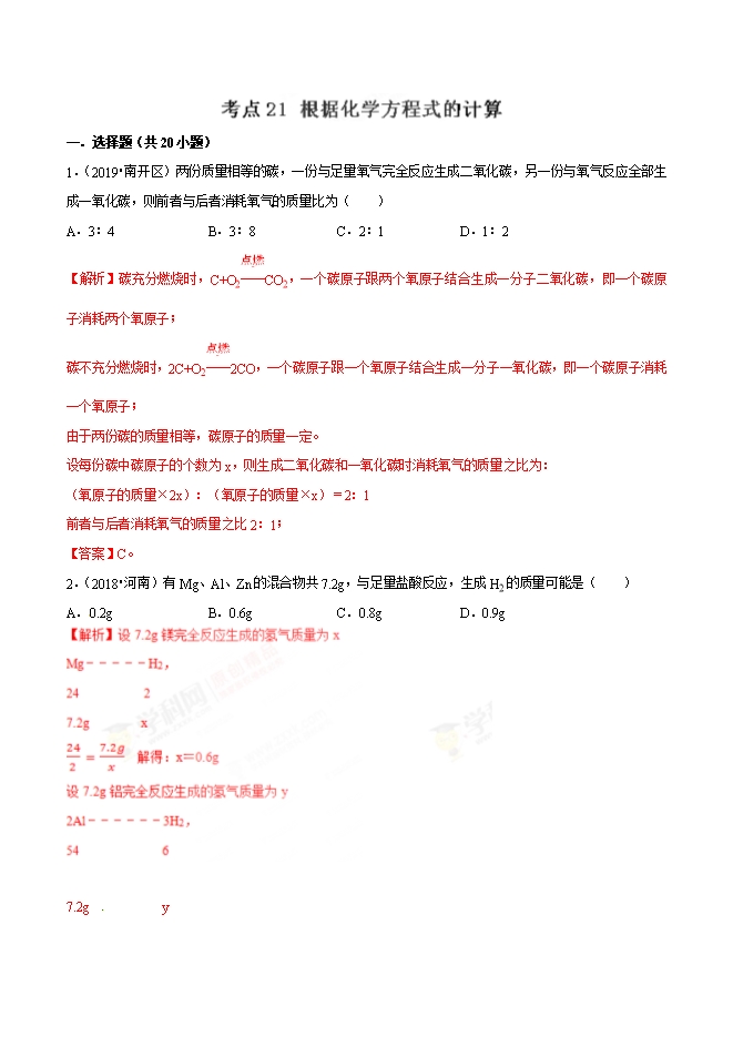 【内容简介】2019年中考九年级化学必刷题考点21 有关化学方程式的计算(解析版)