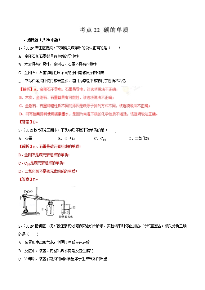 【内容简介】2019年中考九年级化学必刷题考点22 碳的单质(解析版)