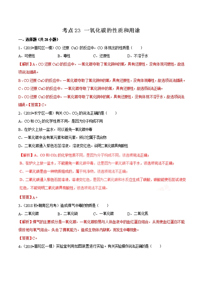 【内容简介】2019年中考九年级化学必刷题考点23 一氧化碳的性质和用途(解析版)