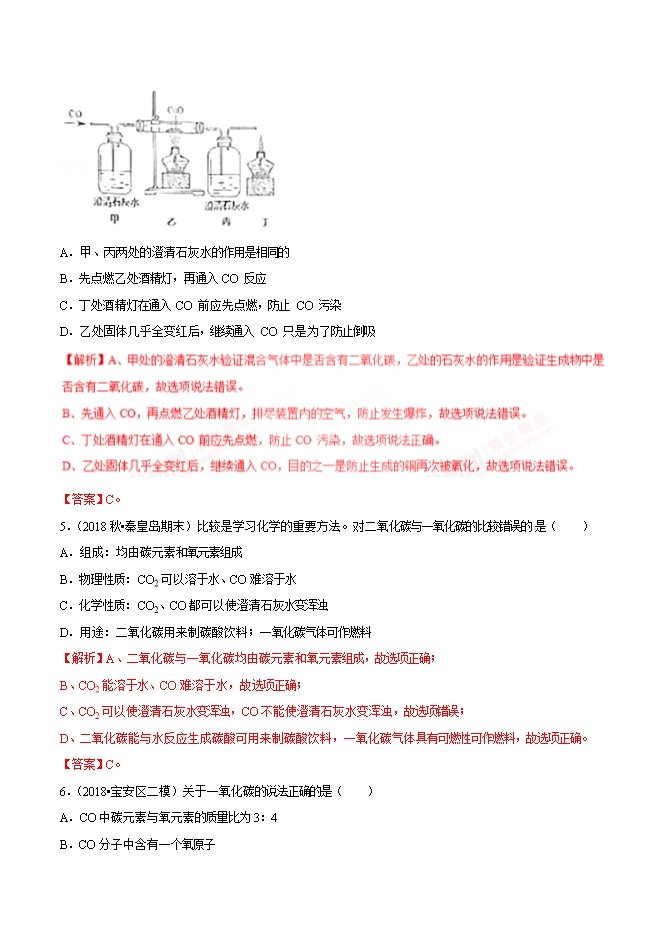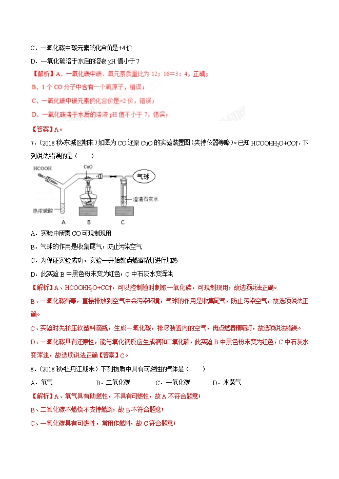 2019年中考九年级化学必刷题考点23 一氧化碳的性质和用途(解析版)