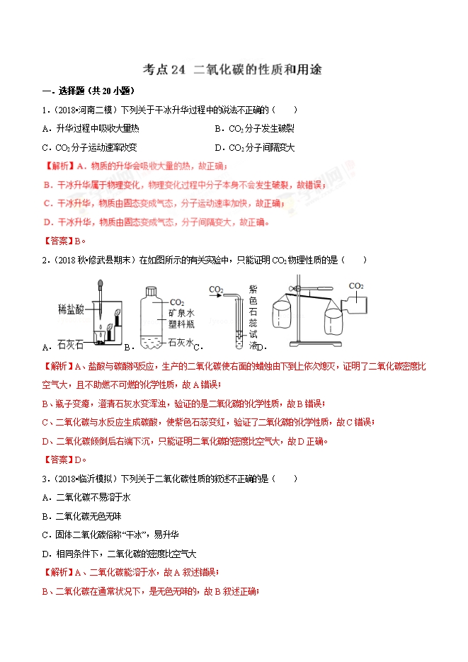 【内容简介】2019年中考九年级化学必刷题考点24 二氧化碳的性质和用途(解析版)