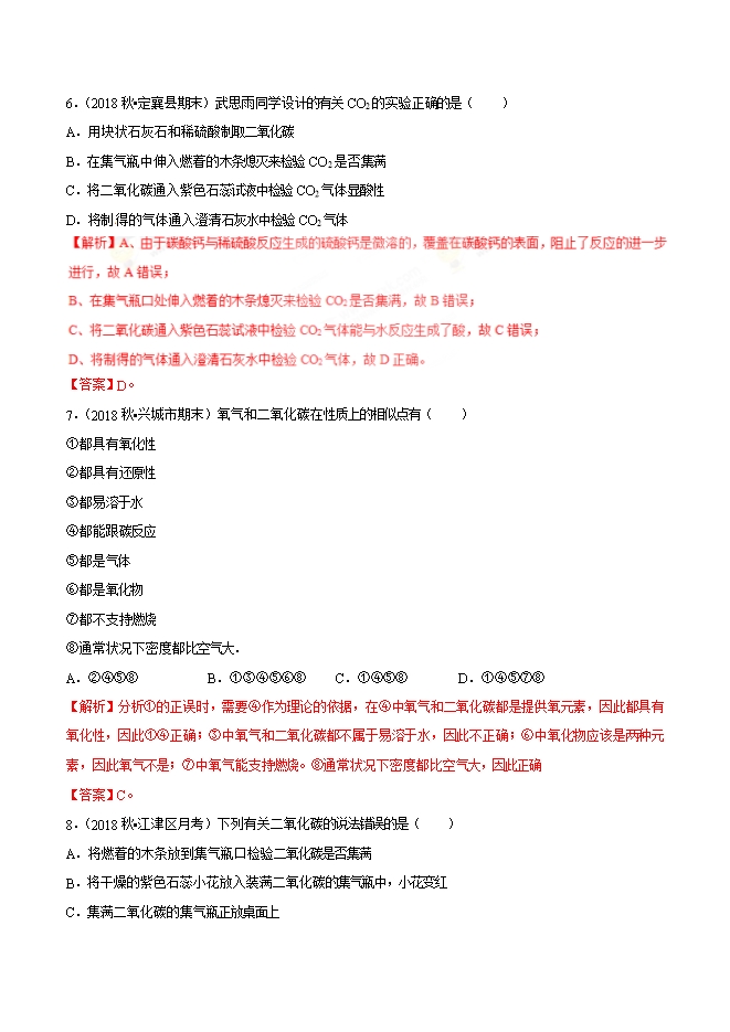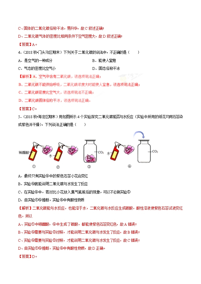 2019年中考九年级化学必刷题考点24 二氧化碳的性质和用途(解析版)