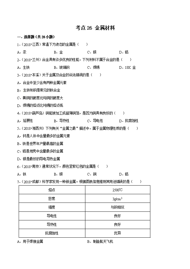 【内容简介】2019年中考九年级化学必刷题考点26 金属材料(原卷版)