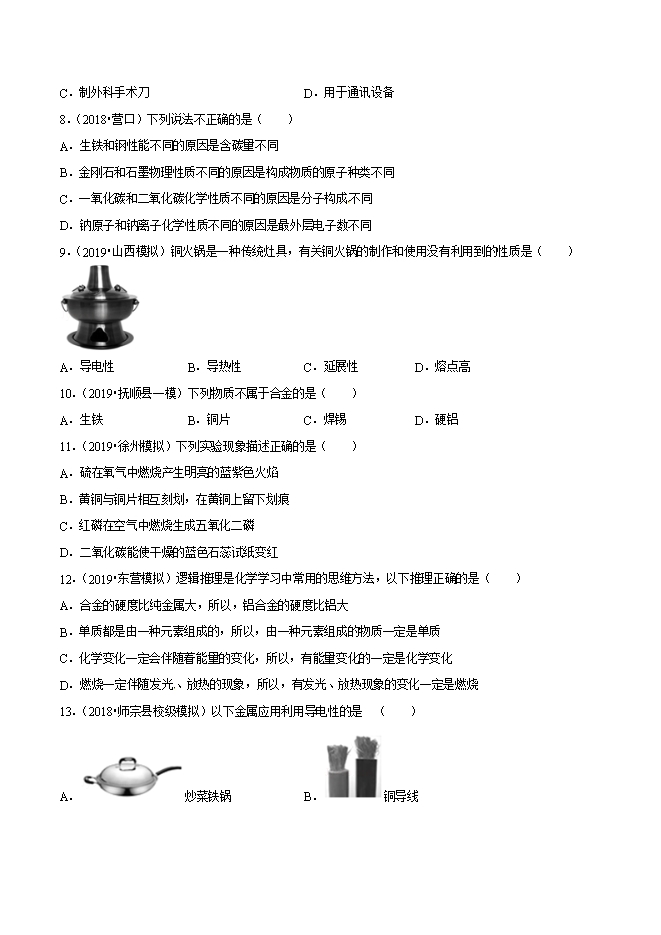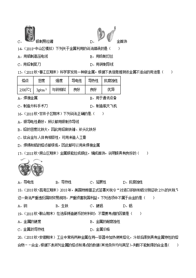 2019年中考九年级化学必刷题考点26 金属材料(原卷版)
