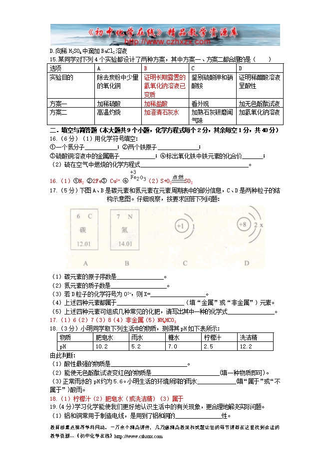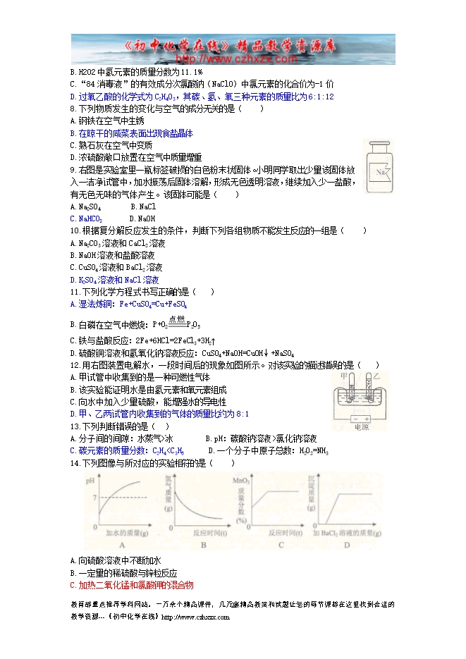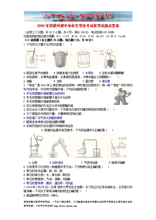 2010年楚雄州初中毕业生学业考试化学试题及答案