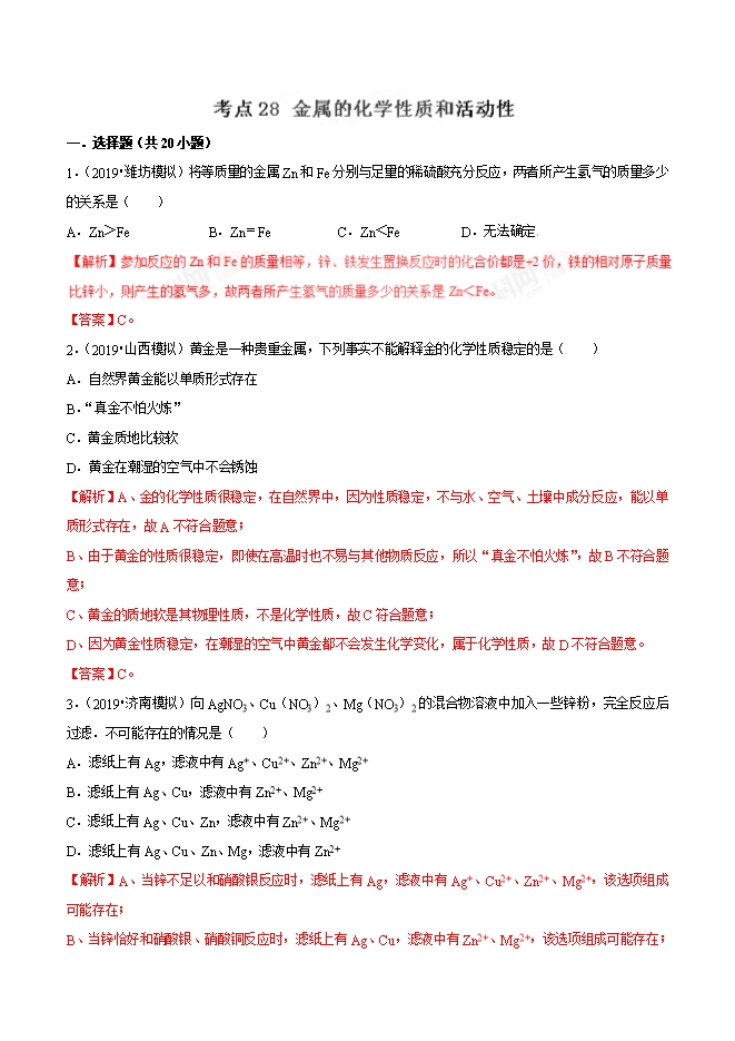 【内容简介】2019年中考九年级化学必刷题考点28 金属的化学性质和活动性(解析版)