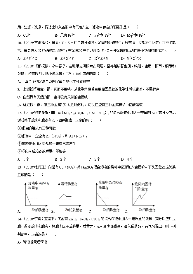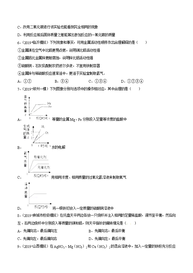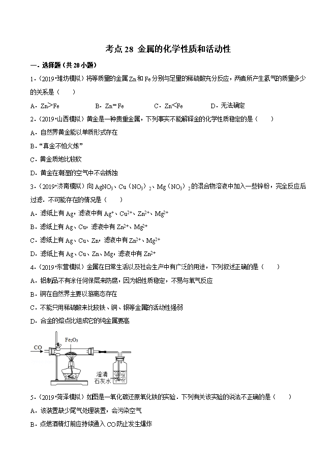 【内容简介】2019年中考九年级化学必刷题考点28 金属的化学性质和活动性(原卷版)