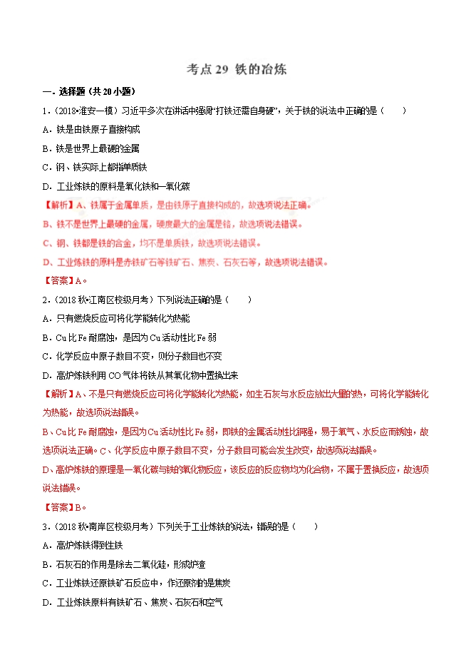 【内容简介】2019年中考九年级化学必刷题考点29 铁的冶炼(解析版)
