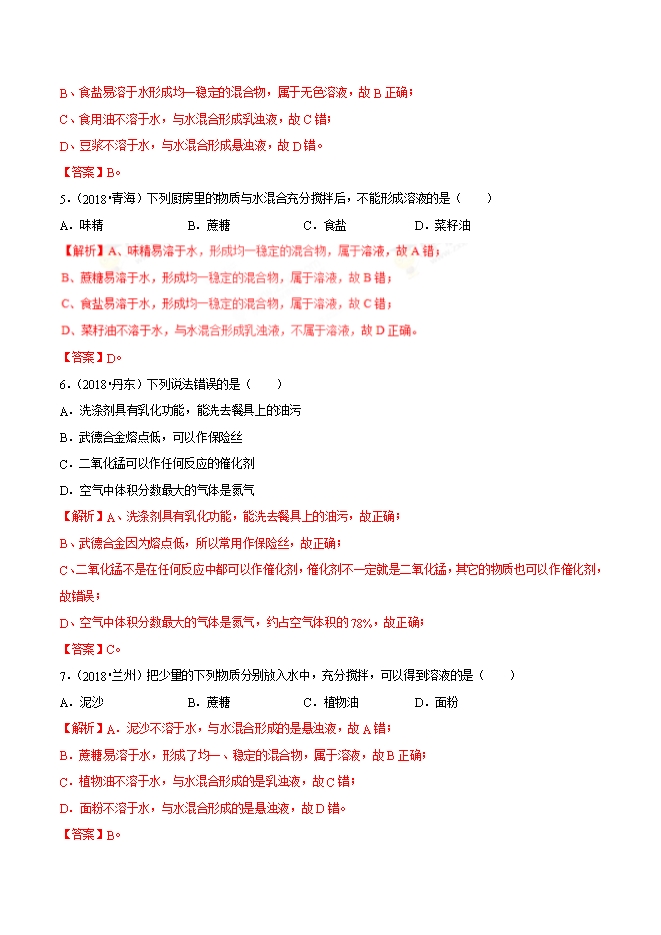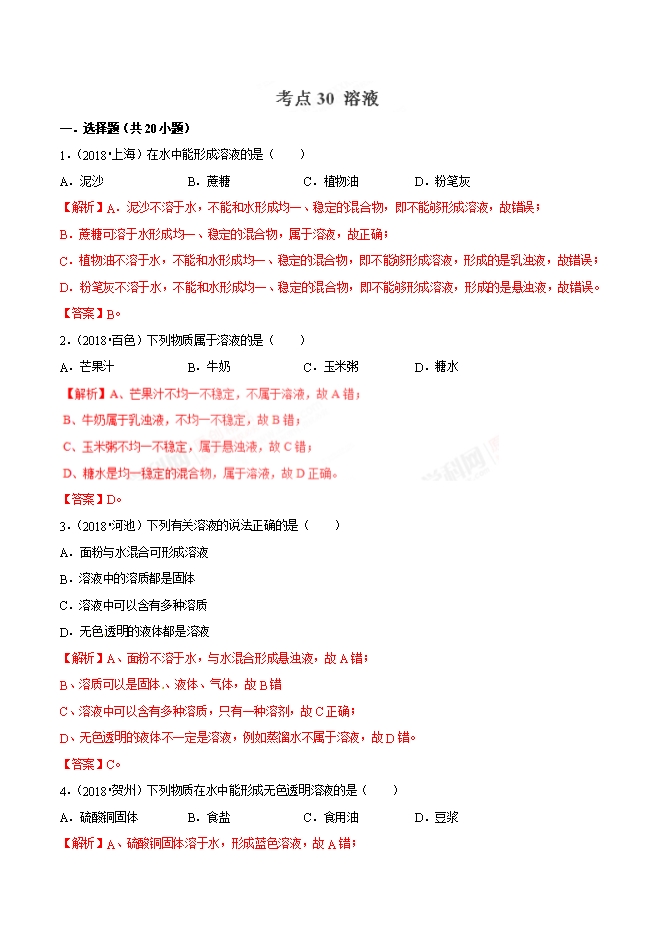 【内容简介】2019年中考九年级化学必刷题考点30 溶液(解析版)