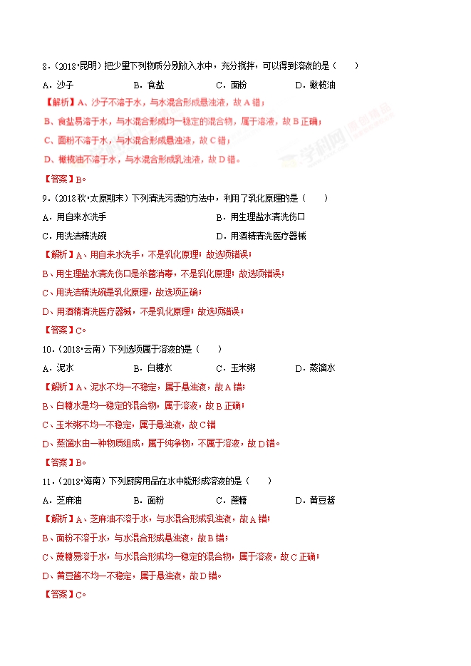 2019年中考九年级化学必刷题考点30 溶液(解析版)