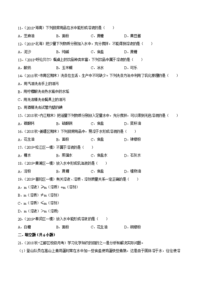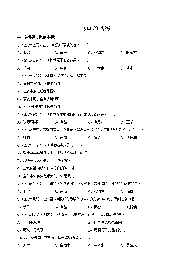 【内容简介】2019年中考九年级化学必刷题考点30 溶液(原卷版)