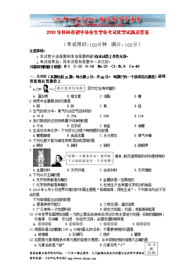 2010年桂林市初中毕业生学业考试化学试题及答案