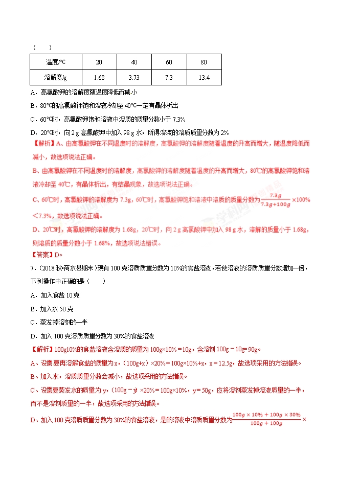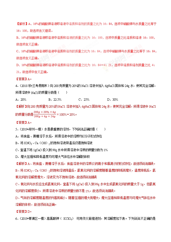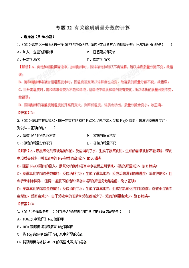 【内容简介】2019年中考九年级化学必刷题专题32有关溶质质量分数的计算(解析版)