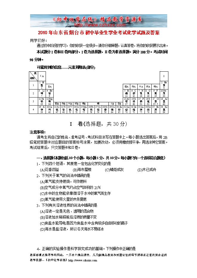 2010年山东省烟台市初中毕业生学业考试化学试题及答案
