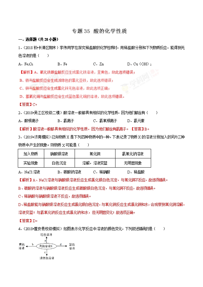 【内容简介】2019年中考九年级化学必刷题专题35 酸的化学性质(解析版)