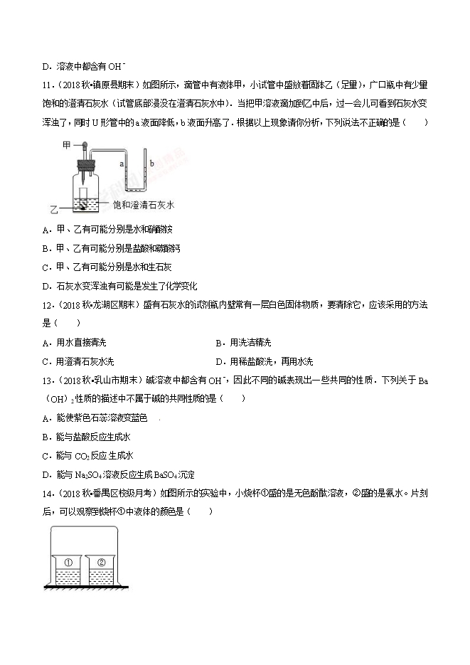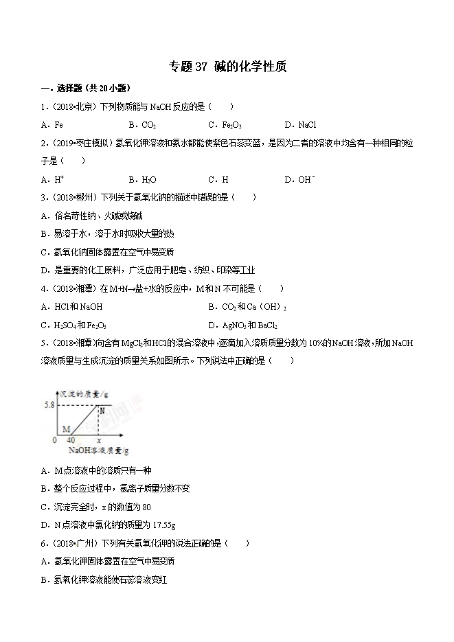 【内容简介】2019年中考九年级化学必刷题专题37 碱的化学性质(原卷版)