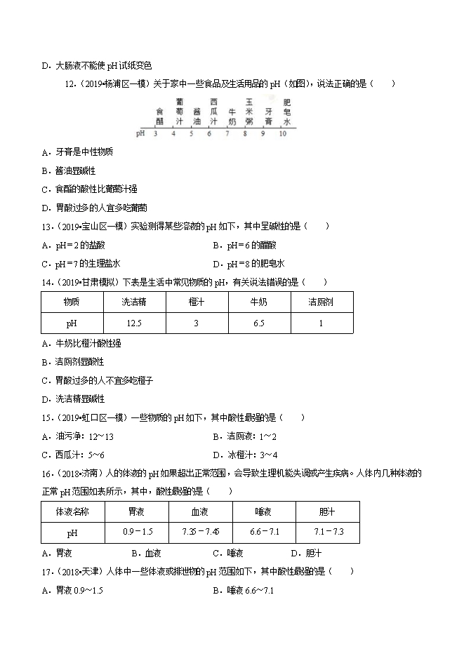 【内容简介】2019年中考九年级化学必刷题专题38 溶液的pH值(原卷版)