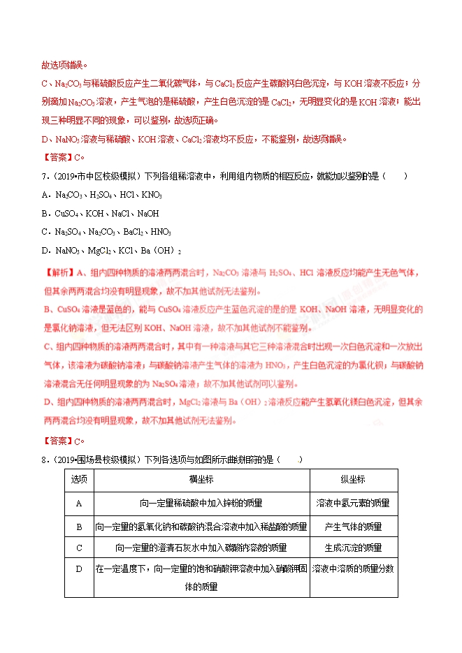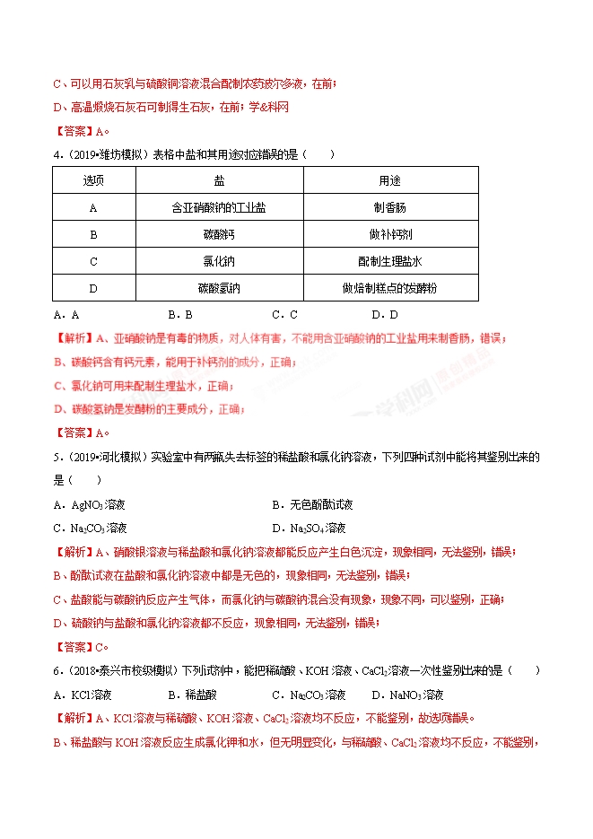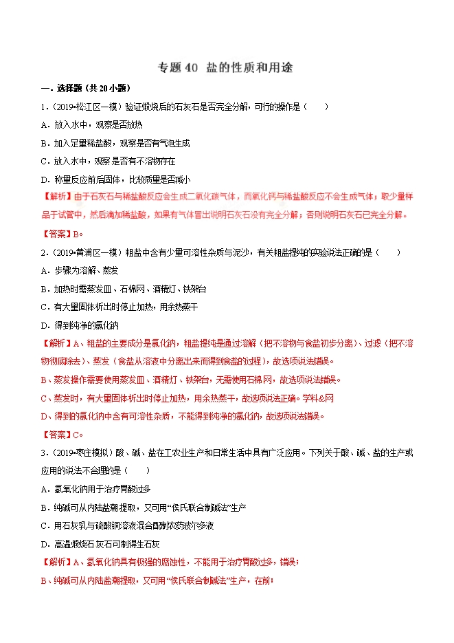【内容简介】2019年中考九年级化学必刷题专题40 盐的性质和用途(解析版)