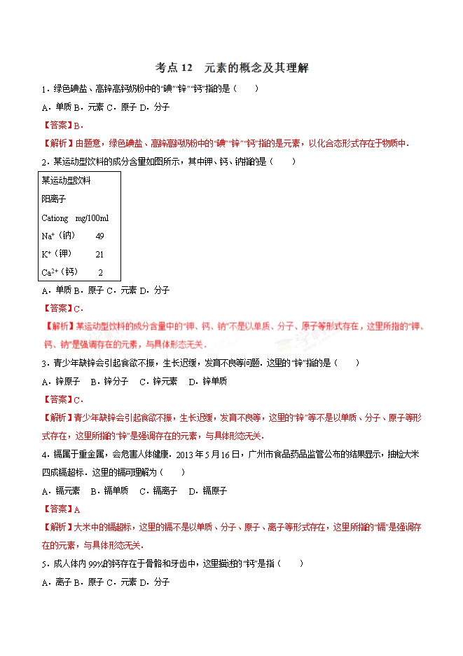 【内容简介】2019年九年级化学中考考点突破考点12 元素的概念及其理解(解析版)