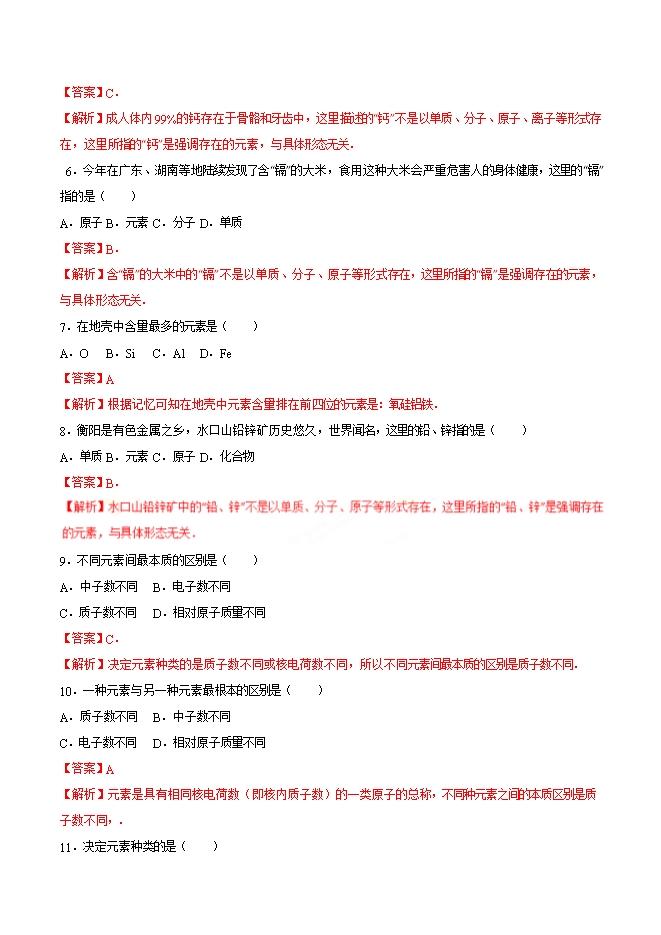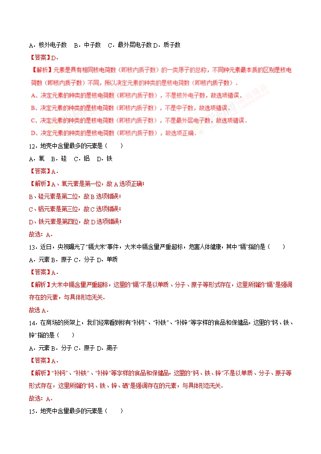 2019年九年级化学中考考点突破考点12 元素的概念及其理解(解析版)