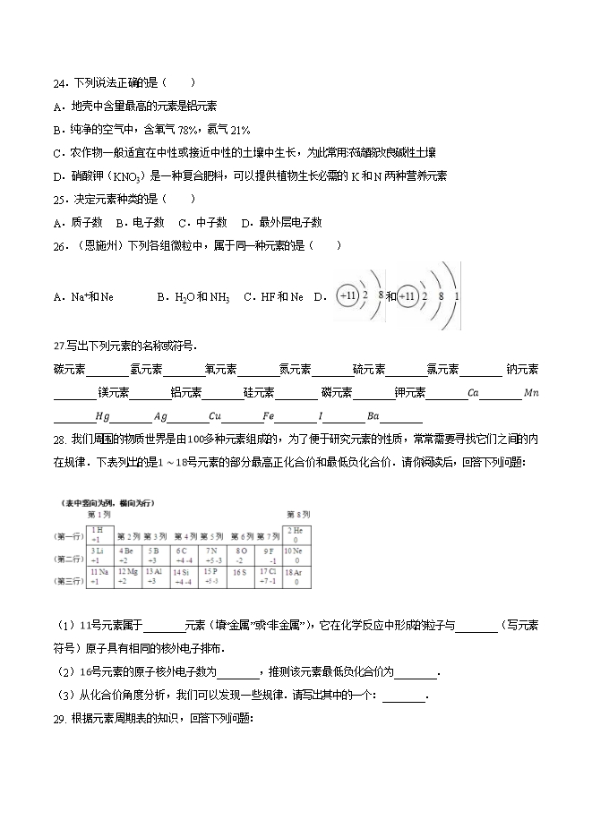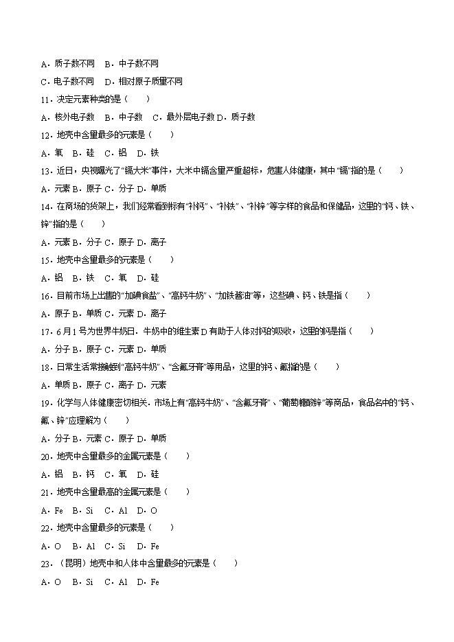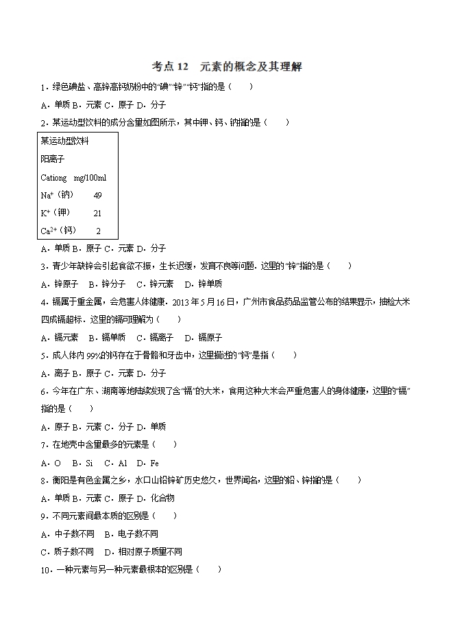 【内容简介】2019年九年级化学中考考点突破考点12 元素的概念及其理解(原卷版)