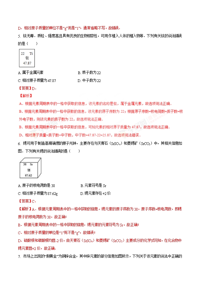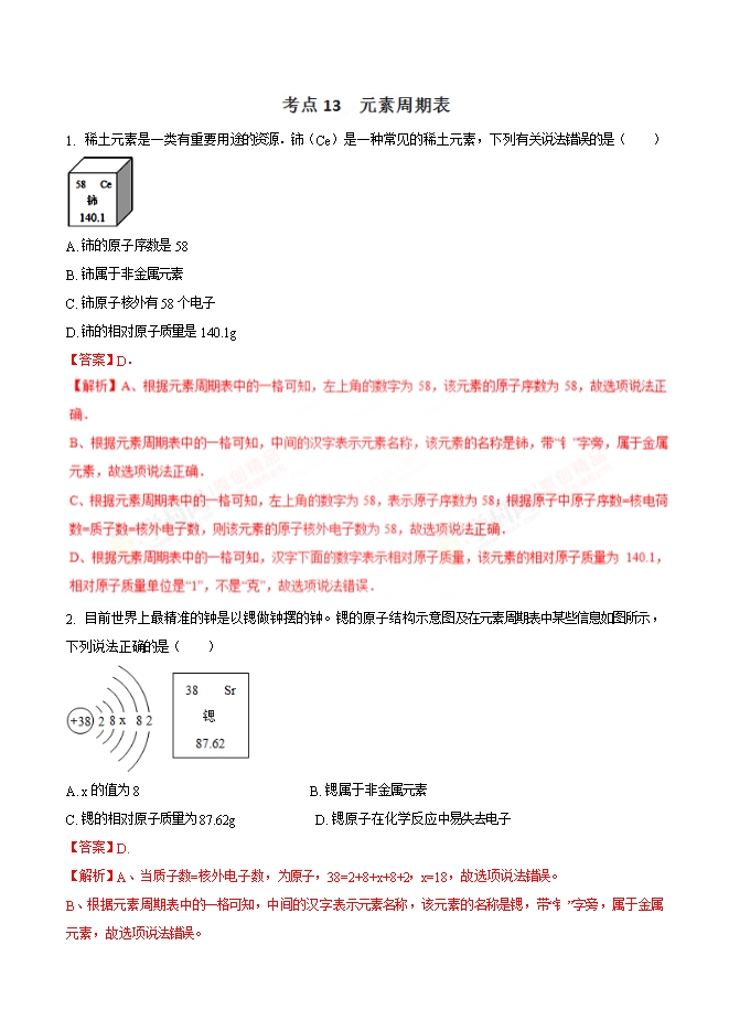 2019年九年级化学中考考点突破考点13 元素周期表(解析版)