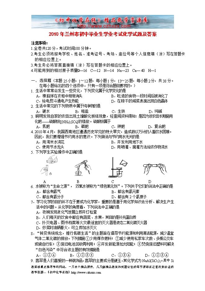 2010年兰州市初中毕业生学业考试化学试题及答案