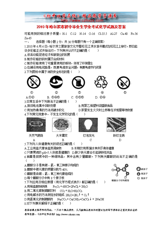 2010年哈尔滨市初中毕业生学业考试化学试题及答案