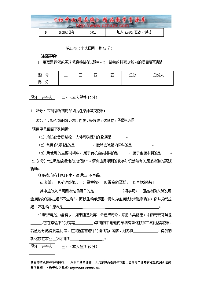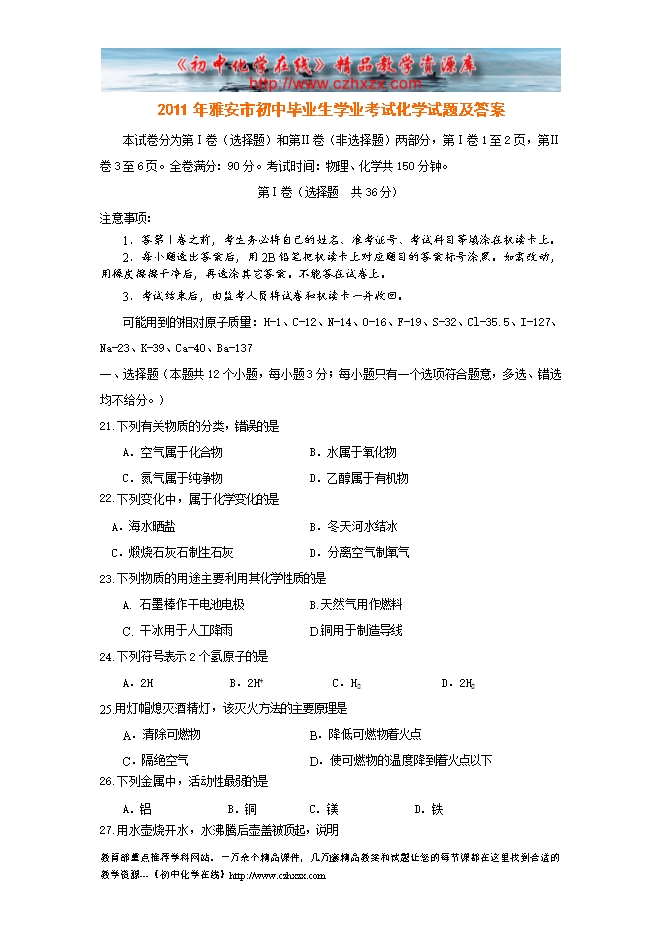 2011年雅安市初中毕业生学业考试化学试题及答案