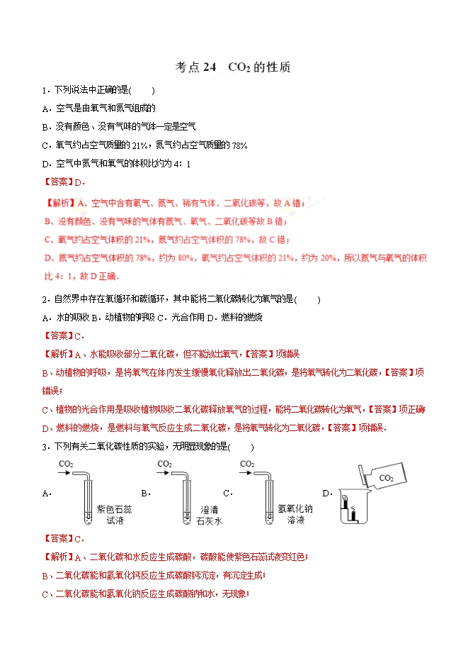 【内容简介】2019年九年级化学中考考点突破考点24 CO2的性质(解析版)